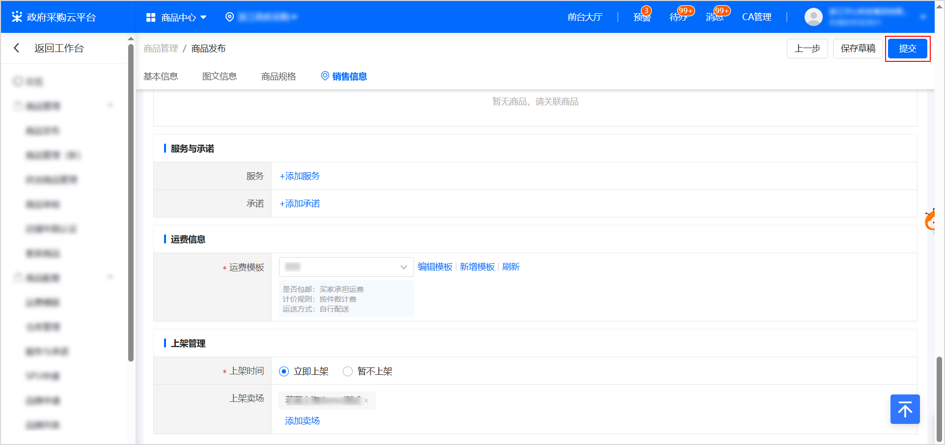上架管理:選擇立即上架,勾選賣場后,該商品進入協(xié)議商品審核流程,流程通過后,直接上架至賣場;選擇暫不上架,該商品為基礎商品,需后續(xù)關聯協(xié)議,上架至賣場。