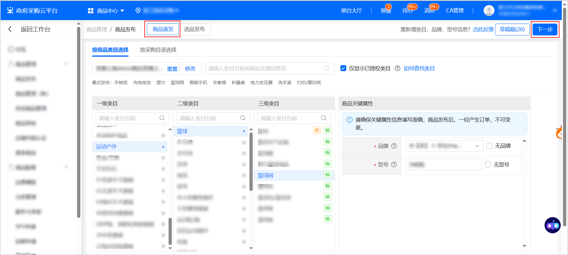 在 商品直發(fā) 標簽頁,選擇需要上架商品的賣場,逐級選擇商品類目,選擇品牌與型號,點擊 下一步。