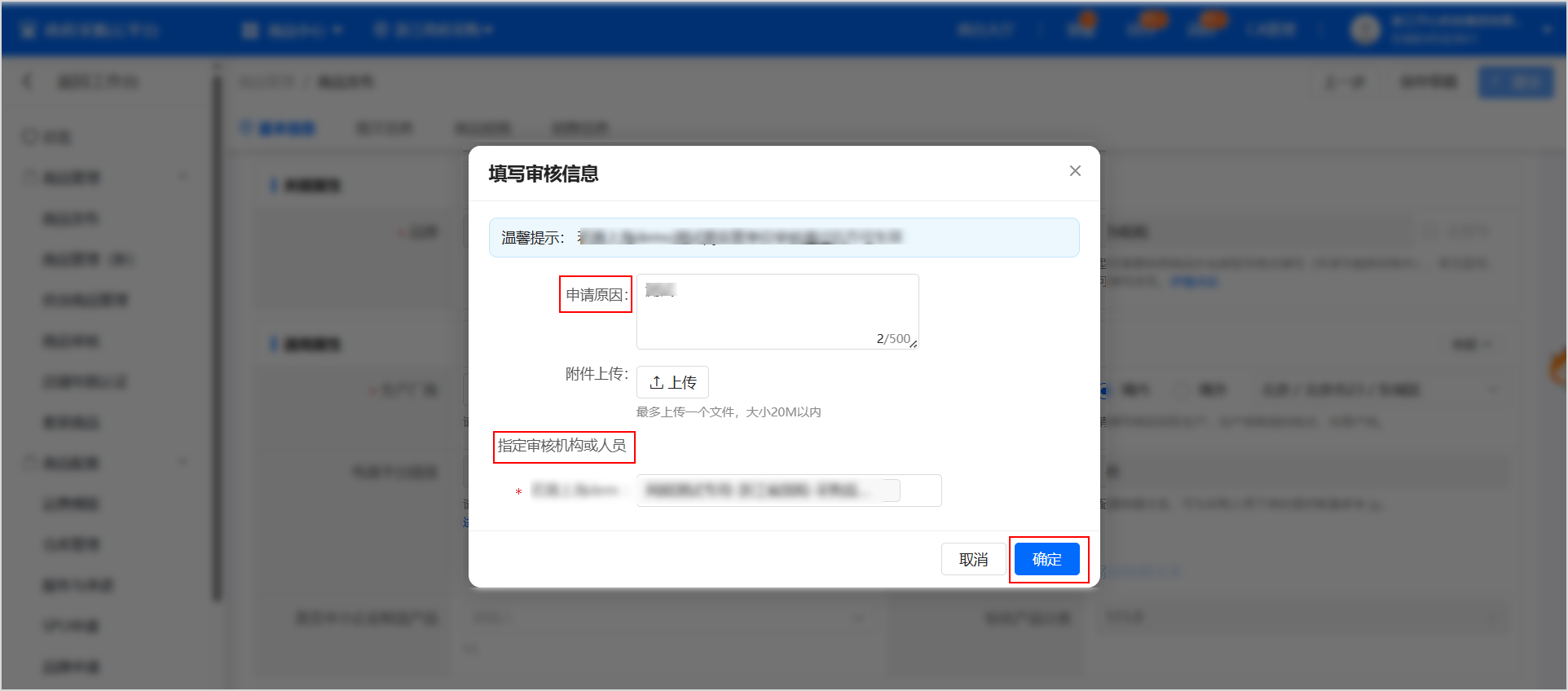 在 填寫審核信息 彈窗中,填寫 申請原因,選擇 指定審核機構或人員,點擊 確定。
