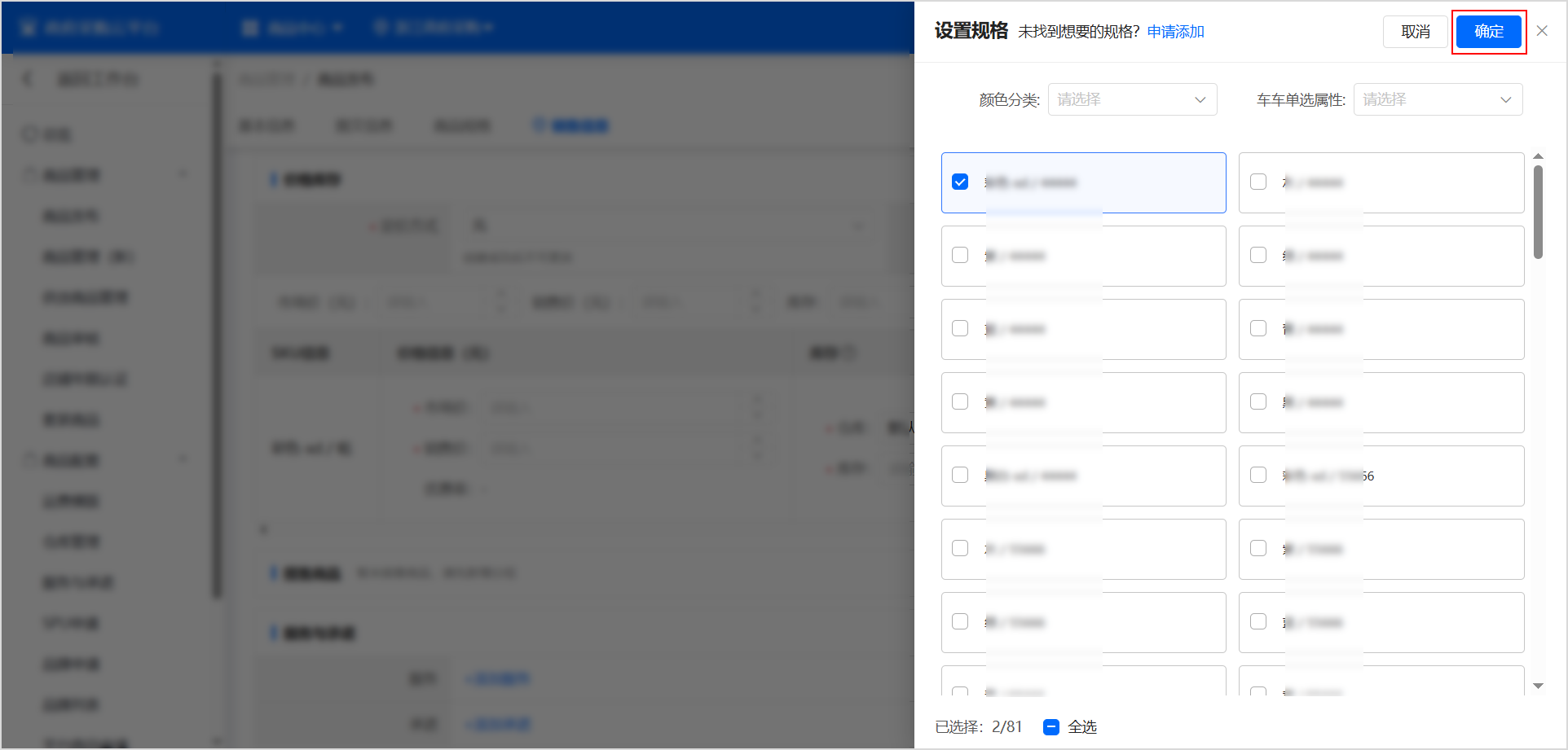 點擊 添加規(guī)格,在 設置規(guī)格 面板,選擇符合商品的規(guī)格,點擊 確定。