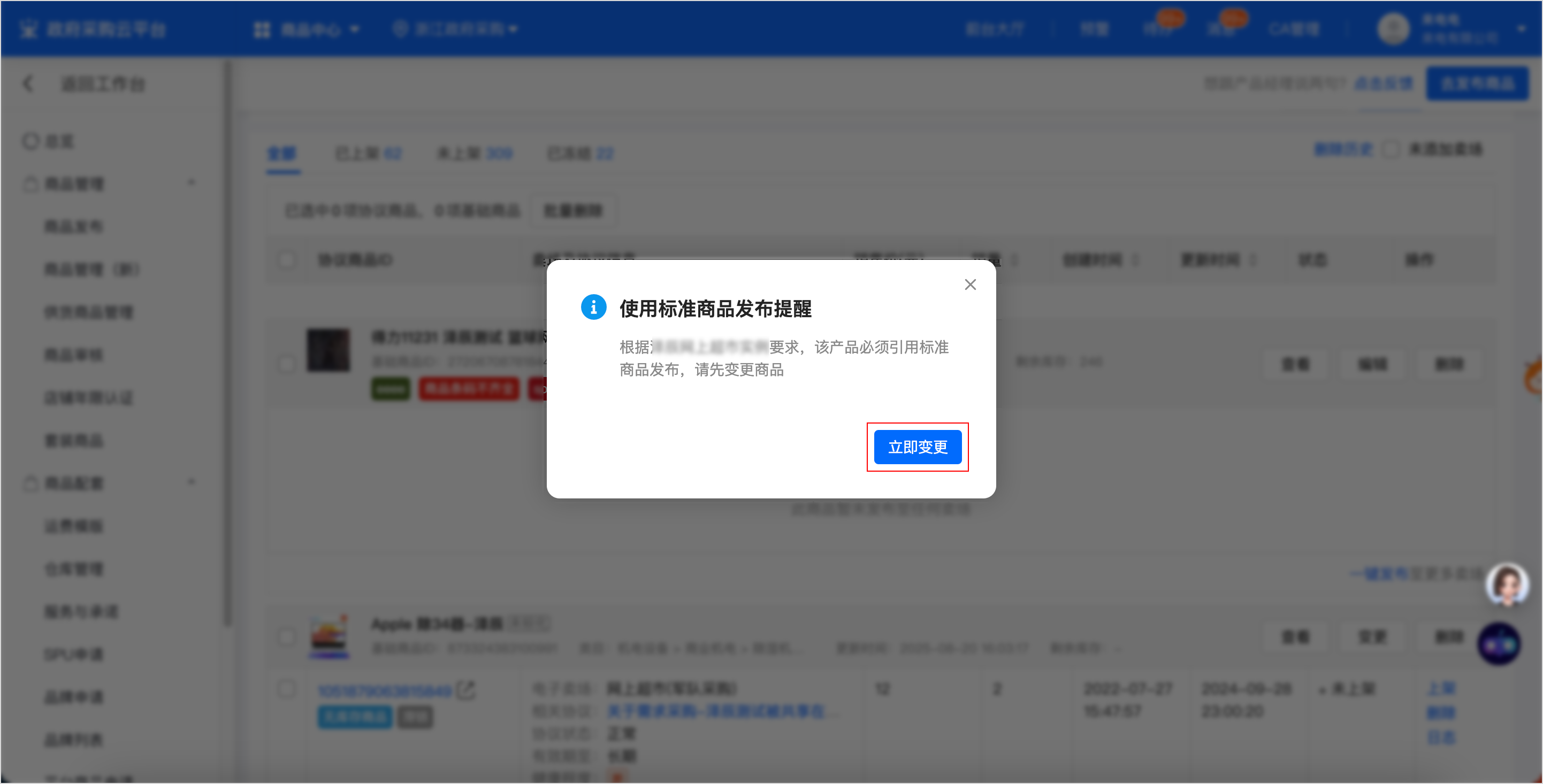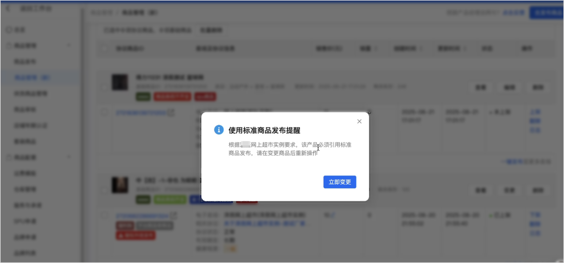 提示:根據(jù)該賣(mài)場(chǎng)要求,該產(chǎn)品必須引用標(biāo)準(zhǔn)商品發(fā)布,請(qǐng)先變更商品后重新操作。點(diǎn)擊 立即變更,按標(biāo)準(zhǔn)商品編輯并進(jìn)行提交后,返回 商品管理 頁(yè)面重新選擇賣(mài)場(chǎng)并執(zhí)行發(fā)布,商品才會(huì)成功上架。