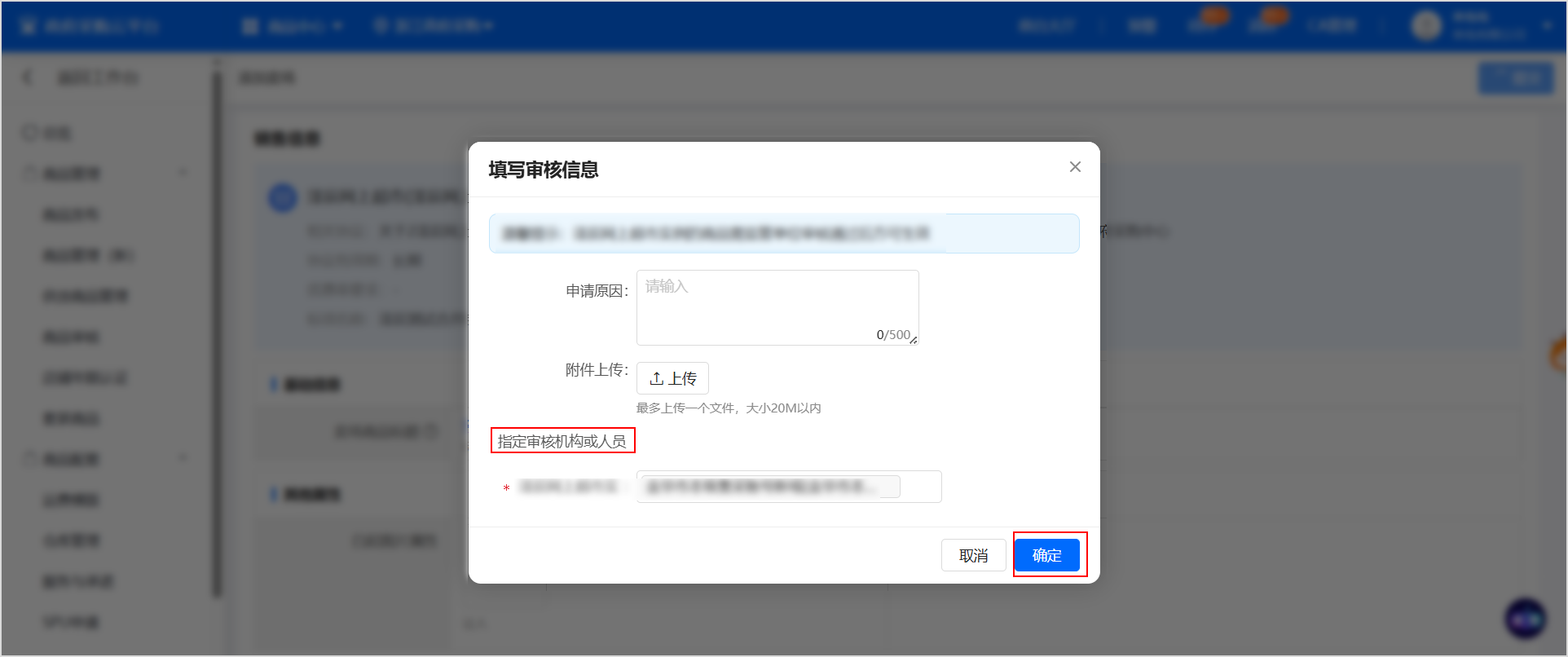 在 填寫(xiě)審核信息 彈窗中,選擇 指定審核機(jī)構(gòu)或人員,點(diǎn)擊 確定。