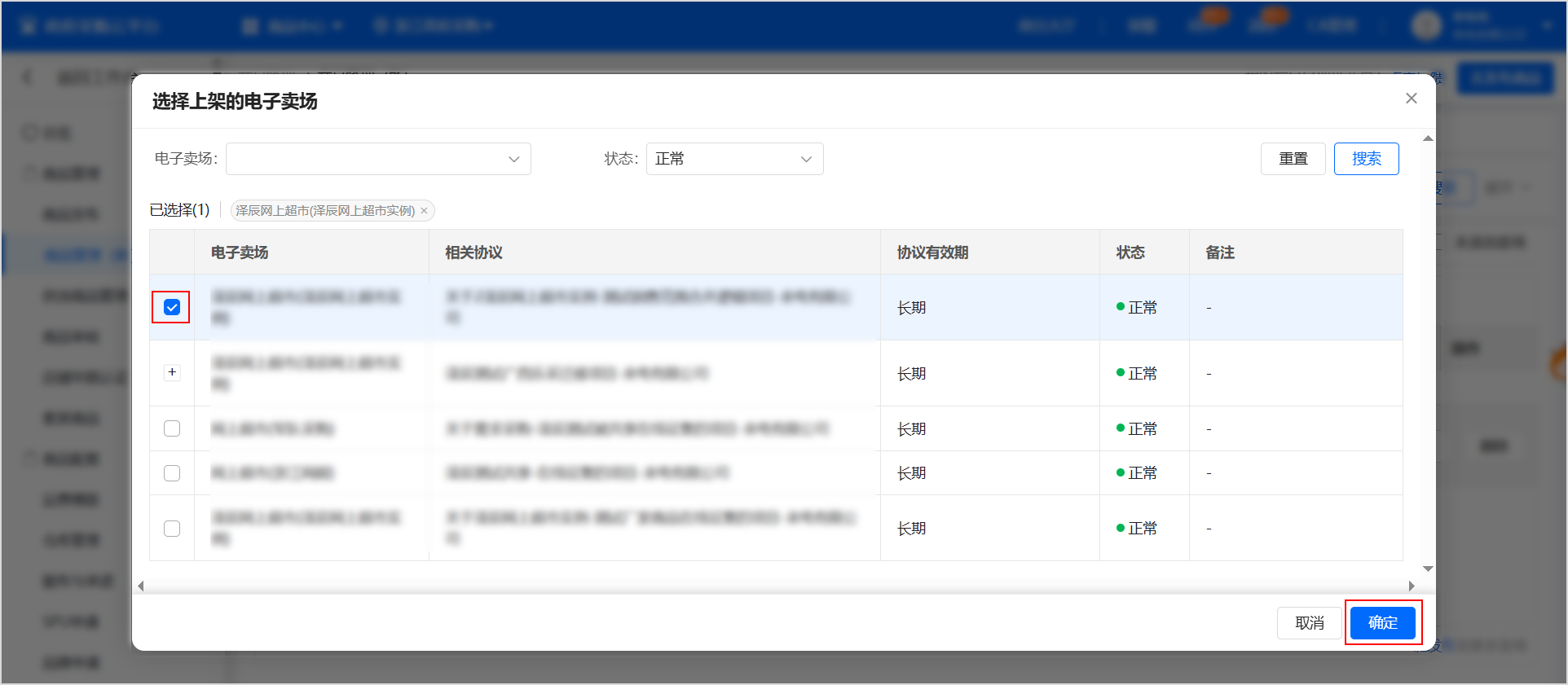 在 選擇上架的電子賣(mài)場(chǎng) 彈窗中,選擇賣(mài)場(chǎng),點(diǎn)擊 確定。